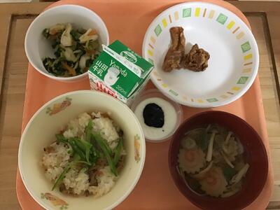 給食のメニューは「深川めし」「牛乳」「鶏肉米粉唐揚げ」「小松菜のからし和え」「温麺汁」「ブラマンジェブルーベリー」で、高等部最後の給食をおいしくいただきました。